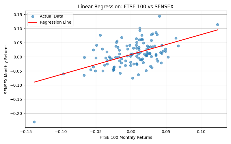 To see if movements in the UK’s FTSE 100 index could help predict what happens in India’s stock markets, specifically the NIFTY and SENSEX. To do this, we looked at how daily returns in the FTSE relate to returns in the Indian indices using a simple statistical method called linear regression.